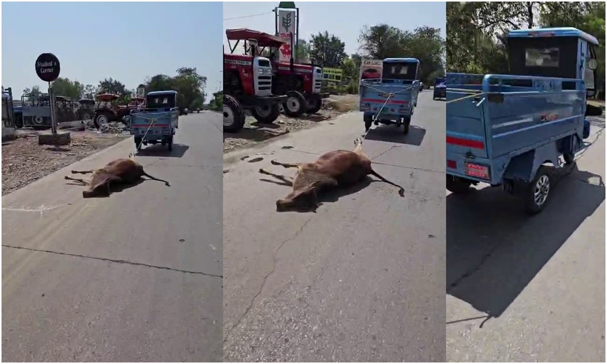 मृत गाय को ऑटो से घसीटने का वीडियो वायरल, गौसेवक नदारद, सामने आया संवेदनहीनता का मामला।