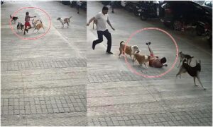 आवारा कुत्तों के झुंड ने बच्चे पर किया हमला, वहां खड़े युवक ने बचाई, दहशत में बच्चा।