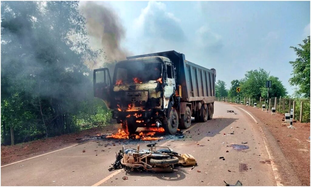हाईवा की चपेट में स्कूली छात्र, गुस्से में ग्रामीणों ने हाईवा को किया आग के हवाले।