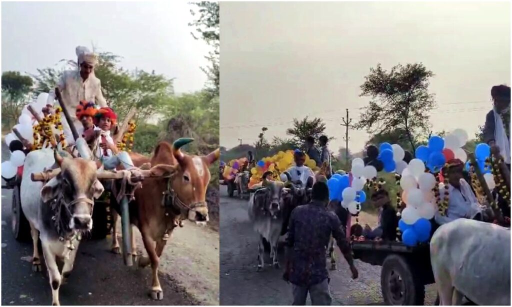 दुल्हन को लेने एक दर्जन से ज्यादा बैलगाड़ियों का काफिला लेकर पहुंचा दूल्हा, लोगों में कौतुहल।