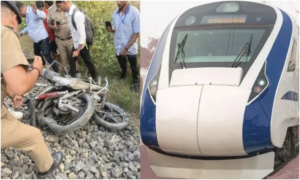 तेज गति से चलते वंदे भारत एक्सप्रेस के सामने ट्रैक पर टकराई बाइक, इंजन में दूर तक घिसटती रही।
