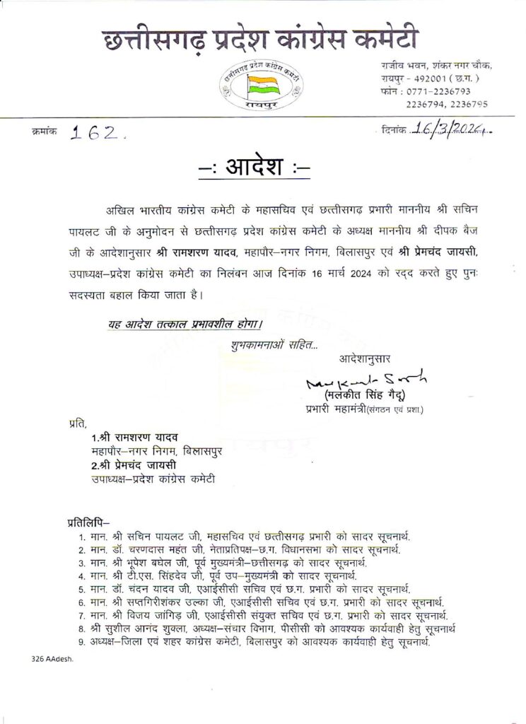 बिलासपुर : नगर निगम बिलासपुर के महापौर रामशरण यादव का निलंबन रद्द कर पार्टी ने सदस्यता बहाल कर दी है। छत्तीसगढ़ प्रदेश कांग्रेस कमेटी के प्रभारी महामंत्री मलकीत सिंह गैदू ने यह आदेश जारी किया है। विधानसभा चुनाव के दौरान टिकिट लेनदेन के संबध में ऑडियो वायरल होने की वजह से महापौर को निलंबित किया गया था, जिसको लेकर बवाल मचा था और रामशरण यादव को पार्टी ने निलम्बित कर दिया था।