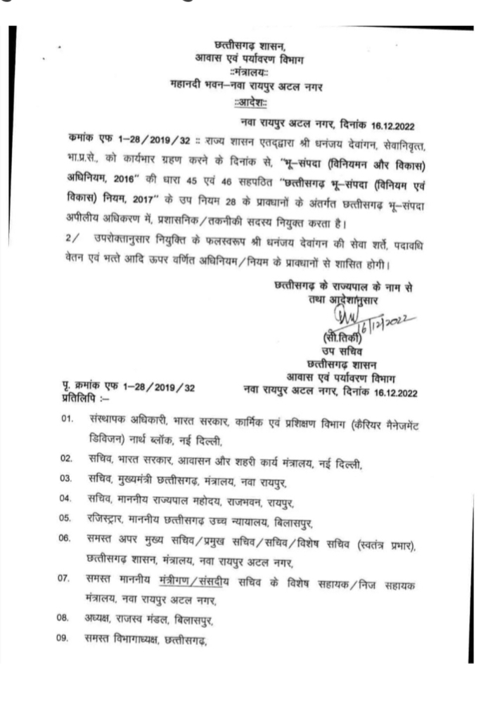 रायपुर। राज्य शासन द्वारा “छत्तीसगढ़ भू- संपदा अपीलीय अधिकरण” में प्रशासनिक सदस्य के रूप में भारतीय प्रशासनिक सेवा के सेवानिवृत्त अधिकारी धनंजय देवांगन और विधिक सदस्य के रूप में अरविंद कुमार चीमा की नियुक्ति की गई।