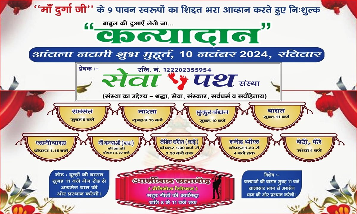जहाँ एक बेटी का पिता होना समाज में गर्व करने वाली बात है, वहीं वर्तमान कुरीतियों के कारण एक पिता पर कर्ज लेकर बेटियों का विवाह करना एक अभिशाप भी बनता जा रहा है। बेटी के विवाह में भव्य आयोजन करने के आडंबर और एक दूसरे से अधिक दहेज देने की होड़ का अनुसरण करते – करते मध्यम वर्गीय पिता अपनी बेटी की शादी तो धूमधाम से कर लेता है, उसके बाद वो पूरी जिन्दगी मेहनत करके उस शादी का कर्ज चुकाते-चुकाते बुढ़ा हो जाता है। यानी कि एक बेटी के पिता का फर्ज निभा पाना बहुत ही कष्टदायक है। वहीँ एक विवाह को करने के लिये मध्यमवर्ग लगभग 10 – 15 लाख का खर्चा भी उठाता है। वहीँ जब नौ कन्याओं का विवाह एक स्थान पर होता है और उसका खर्च समाज के वरिष्ठों द्वारा वहन किया जाता है, तो माता-पिता को बड़ी राहत मिलती है। ऐसे में प्रतिवर्ष सेवा पथ का यह कार्य बेहद ही प्रशंसनीय है।