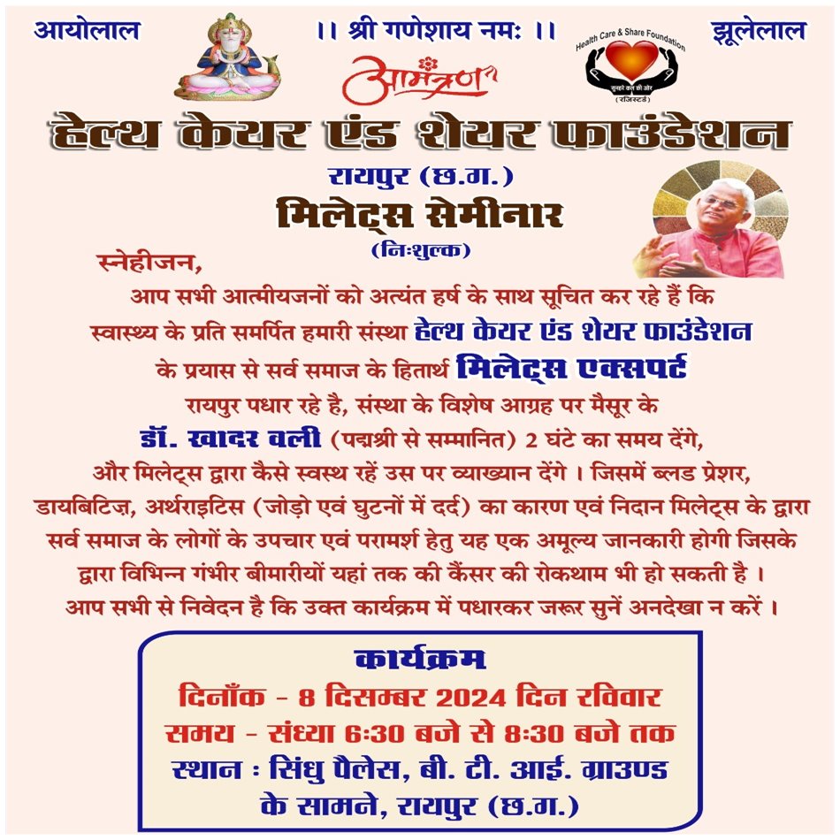 इसके लिये आपको चाहिये एक मिलेट एक्सपर्ट की सलाह जो आपको इस बारे में सही जानकारी दे सके, ऐसे में हेल्थ केयर एंड शेयर द्वारा मुफ्त मिलेट्स सेमिनार 8 दिसम्बर को सिन्धु पैलेस में आयोजित किया गया है। इसके लिये मैसूर के डॉक्टर खादर वाली जो कि पद्मश्री से सम्मानित है,वो इस पर अपना व्याखान्न देंगे, जिससे ब्लड प्रेशर, डायबीटीज, जोड़ों और घुटनों के दर्द, का कारण बता सकें और साथ ही उनका निदान कर सकें। इस स्वास्थ्य के लिये जागरूक करने वाले कार्यक्रम के आयोजक है, किशोर राजदेव, मोहन आहूजा, गोपाल दुलहनी, ओमप्रकाश तीर्थानि, देवराज गुरनानी, साथ ही विशेष सहयोग शंकर नगर , शांति नगर सिन्धी पंचायत का भी है।