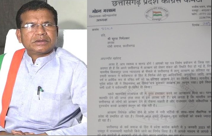 बता दें की आरक्षण संशोधन विधेयक को लेकर 3 जनवरी को रायपुर में कांग्रेस महारैली निकालेगी। ऐसे में पीसीसी चीफ मोहन मरकाम ने प्रदेश के सभी समाज प्रमुखों को पत्र लिखा है. उन्होंने प्रदेश कांग्रेस कमेटी द्वारा आयोजित रैली में शामिल होने का आमंत्रण भी भेजा है. इसके साथ ही उन्होंने सभी समाज के लोगों से इस मामले में समर्थन माँगा है. मोहन मरकाम ने कहा की