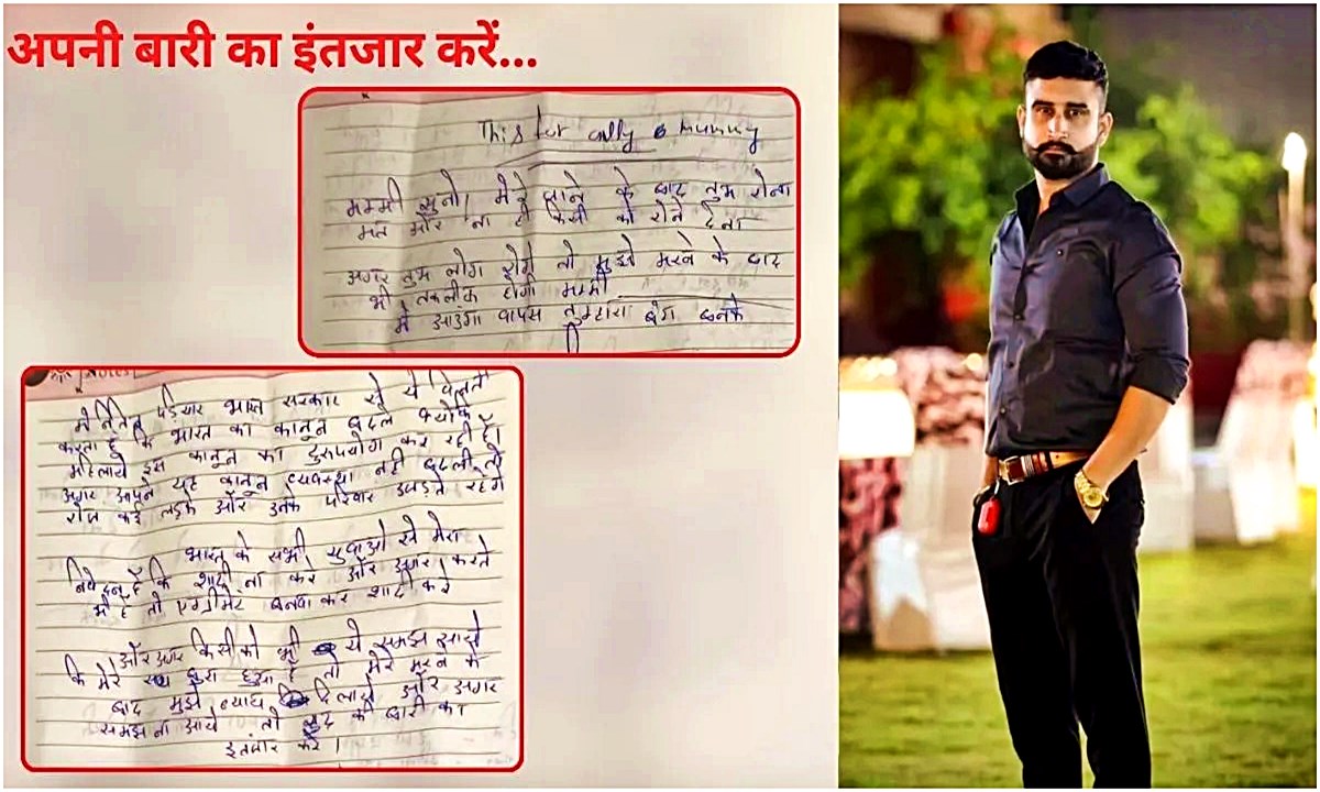 मृतक ने मरने से पहले सुसाइड नोट भी लिखा है। इसमें उसने अपनी पत्नी, सास और पत्नी की दोनों बहनों को अपनी मौत के लिए जिम्मेदार ठहराया है। दो पन्नों के सुसाइड नोट में एक लेटर उसने अपनी मां के लिए, जबकि एक लेटर भारत सरकार से कानून बदलने की मांग को लेकर लिखा है। अपने मां को लिखे लेटर में उसने लिखा है, ‘मम्मी सुनो! मेरे जाने के बाद तुम रोना मत और ना ही किसी को रोने देना। अगर तुम लोग रोओगे तो मुझे मरने के बाद भी तकलीफ होगी। मम्मी मैं वापस तुम्हारा बेटा बनके आऊंगा।’ इसके बाद उसने इसी लेटर में आगे लिखा है, ‘मेरी मौत का कारण सिर्फ और सिर्फ मेरी पत्नी, सास और पत्नी की दोनों बहने हैं।’ इस तरह महिला प्राथमिकता के कानून के कारण युवा आत्महत्या कर रहे है, बेंगलूर से शुरू हुआ मामला अब लगातार नये मामलों के रूप में सामने आ रहा है, ऐसे में ये सवाल उठता है कि क्या अब कानून में बदलाव करना चाहिए?