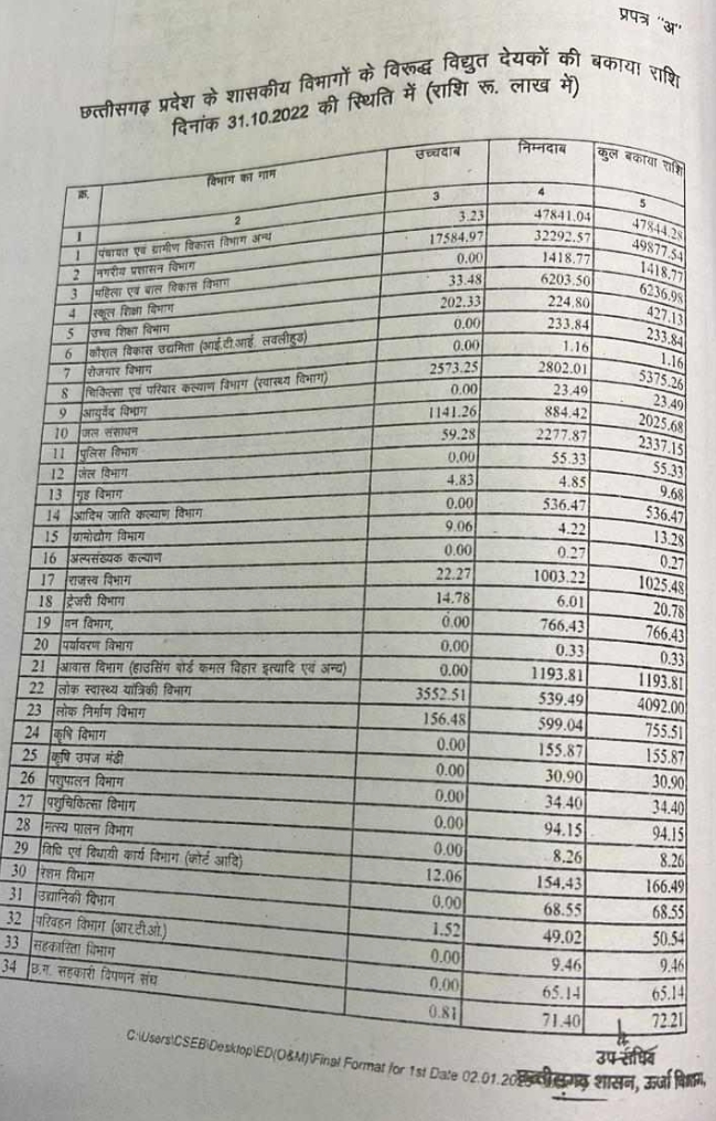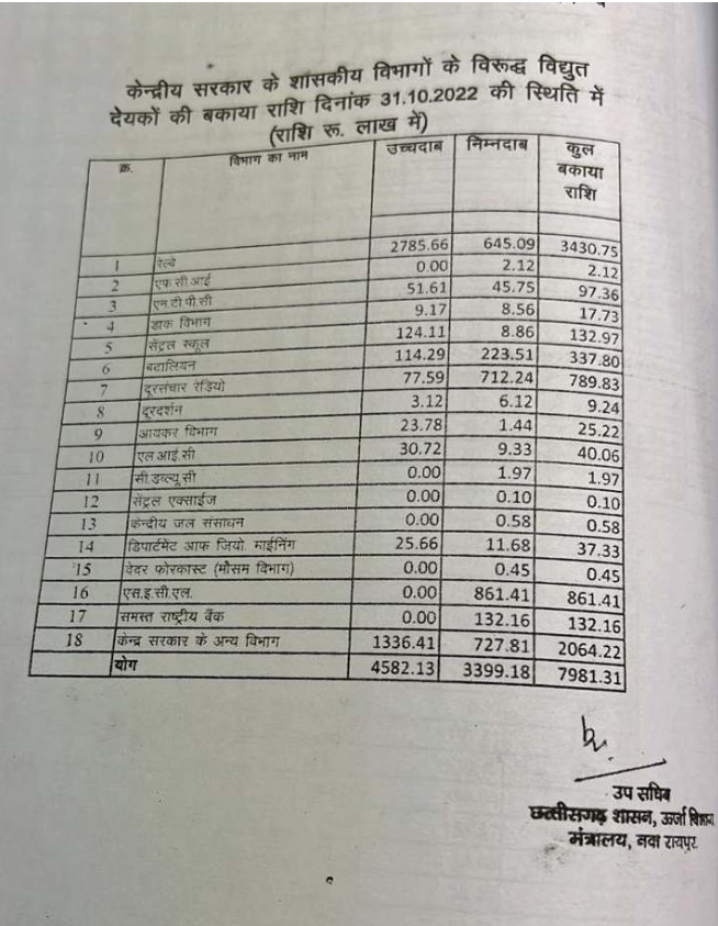 वोरा के प्रश्न का जवाब देते हुए मुख्यमंत्री भूपेश बघेल ने बताया कि 31 अक्टूबर, 2022 की स्थिति में छत्तीसगढ़ राज्य के विभिन्न शासकीय विभागों पर छत्तीसगढ स्टेट पॉवर डिस्ट्रीब्यूशन कंपनी लिमिडेट का कुल बकाया राशि 1,260 करोड़ 62 लाख 92 हजार रुपए है. केंद्रीय सरकार के विभिन्न शासकीय विभागों पर कुल बकाया राशि 79 करोड़ 81 लाख 31 हजार रुपए है।