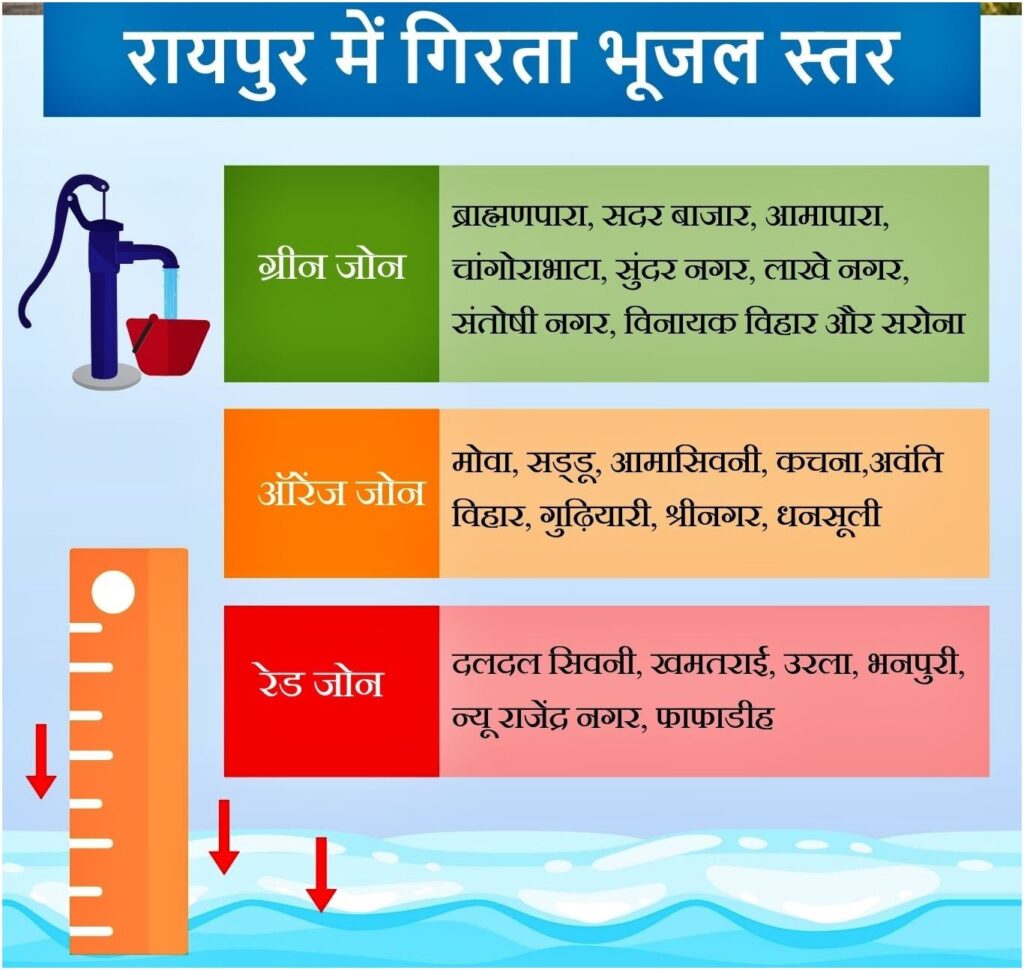 क्यों गिरा भूजल स्तर : डॉ विपिन दुबे का कहना है कि लगभग 15 साल पहले रायपुर का भूजल स्तर काफी अच्छा था। सभी क्षेत्रों में ढाई सौ से 300 फीट में अच्छा पानी उपलब्ध रहता था, लेकिन आज बहुतायत मात्रा में शहरीकरण का कार्य हुआ है। इस दौरान काफी संख्या में मकान बने हैं। अधिकतर मकान में ट्यूबवेल खनन किया गया है। जिससे भूजल का दोहन अधिक मात्रा में हुआ है। इसकी वजह से आज रायपुर का अधिकांश क्षेत्र में भू जल स्तर काफी नीचे चला गया है। भूजलस्तर के नीचे जाने के पीछे कई कारण है। जैसे शहरीकरण होना, आबादी का बढ़ना, कांक्रीट का जंगल बनना और अत्यधिक ट्यूबवेल खनन करना। ऐसे में शहर में बहुत कम ऐसी जगह बची है जो मिट्टी की है और वहां से बरसात का पानी जमीन में जाता है। उससे भूजल का स्तर बढ़ता है, लेकिन देखा जा रहा है कि जल प्रबंधन बहुत अच्छा नहीं है। जल संरक्षण का कार्य भी काफी धीमी गति से चल रहा है। इस वजह से भी भूजल का स्तर नीचे गिरता जा रहा है। बारिश का पानी भी भूमि के अंदर नहीं जा पा रहा है।
