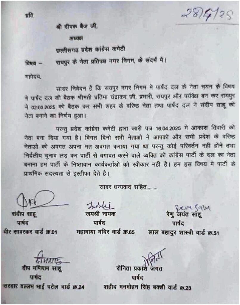 इस्तीफा देने वालों में उप नेता जयश्री नायक समेत 5 पार्षदों ने प्रदेश कांग्रेस कमेटी के अध्यक्ष दीपक बैज के नाम इस्तीफा संबंधी पत्र भेजा है। इस्तीफा देने वालों में जयश्री नायक के साथ ही मनीराम साहू, संदीप साहू, रेणु जयंत साहू, रोनिता प्रकाश जगत के नाम भी शामिल हैं, जिन्होंने अपना इस्तीफा भेजा है।