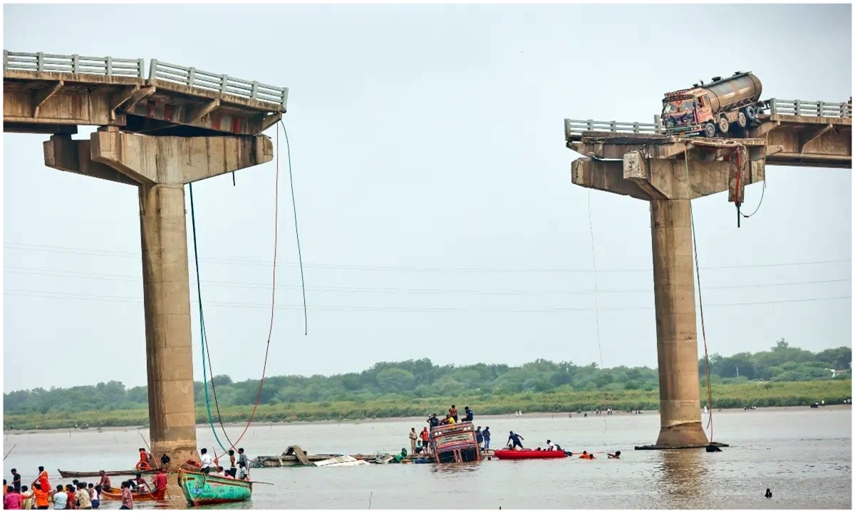 वडोदरा (गुजरात) : बारिश के मौसम में जगह – जगह हादसों कि खबरें लगातार सामने आ रही है, ऐसे ही वडोदरा के पादरा और आणंद ज़िलों को जोड़ने वाला महिसागर नदी पर बना 45 साल पुराना गंभीरा पुल आज सुबह ढह गया है, जिससे स्थानीय लोगों में हड़कंप मच गया है। इस घटना में पुल के ऊपर से गुज़र रहे दो ट्रक, एक बोलेरो जीप और एक जीप समेत चार वाहन दोनों किनारों पर बह रही माही नदी में गिर गए। जिसमें अब तक नौ लोगों के मारे जाने की खबर मिली है। जबकि कई लोगों को बचा भी लिया गया है। बताया गया है कि जब यह हादसा हुआ तो मुजपुर समेत आसपास के गांव के लोगों की भीड़ मौके पर जमा हो गई थी। अचानक यह हादसा हो गया।