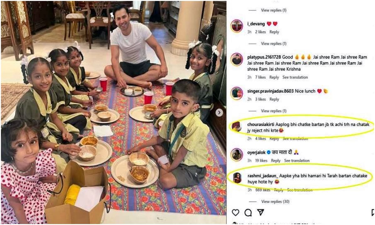 दूसरी तरफ कुछ प्रयोक्ता प्लेट्स पर भी सवाल उठाते दिखे। दरअसल, वरुण इस तस्वीर में खुद तो स्टील की थाली में खाना खा रहे हैं, जबकि बच्चों के लिए डिस्पोजेबल प्लेट में खाना परोसा गया है, जिसे लेकर प्रयोक्ता नाराजगी जाहिर करते दिखे। एक प्रयोक्ता लिखता है- ‘सर अपने लिए स्टील की थाली और बच्चों के लिए डिस्पोजेबल प्लेट।’ एक ने लिखा- ‘बच्चों को पेपर वाली थाली क्यों? असली भाव तो समानता में है।’ इस तरह लोगों ने अपनी – अपनी प्रतिक्रिया दी।