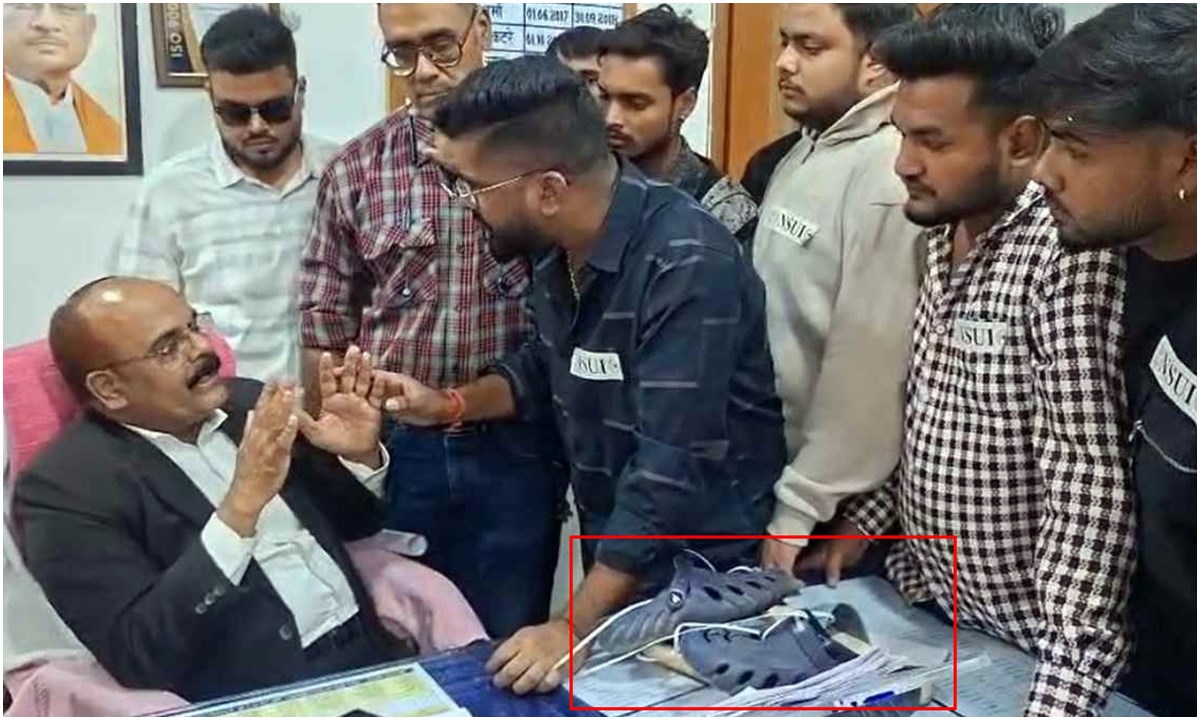 दुर्ग/भिलाई : भिलाई सेक्टर-6 स्थित कल्याण कॉलेज में एनएसयूआई के कार्यकर्ताओं ने भारी प्रदर्शन और जमकर हंगामा किया है यहाँ प्रिंसिपल को जूतों की माला पहनाने का प्रयास किया गया है। मामला है चार महीने पहले कॉलेज से निकाली गई महिला सफाईकर्मियों के साथ कथित तौर पर अभद्र व्यवहार और गाली-गलौज के आरोपों को लेकर कार्यकर्ता अचानक कॉलेज पहुंचे थे और सीधे प्रिंसिपल डॉ. विनय शर्मा के चेंबर में घुस गये। इस दौरान कार्यकर्ताओं ने प्रिंसिपल को जूतों की माला पहनाने की कोशिश की और चेंबर में रखे कई दस्तावेजो को हवा में उछाल दिया, जिससे माहौल काफी तनावपूर्ण हो गया।