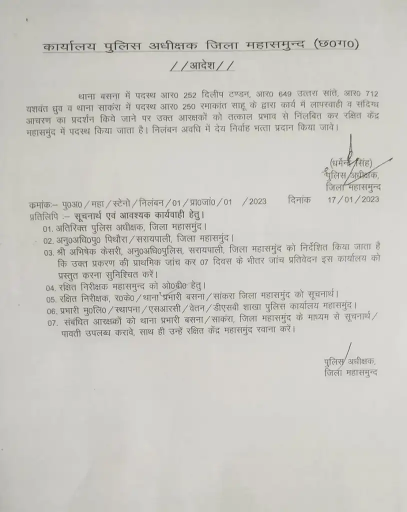 महासमुंद। महासमुंद एसपी ने दो थानों में पदस्थ 4 कांस्टेबल को तत्काल प्रभाव से निलंबित कर दिया हैं। बताया जा रहा हैं कि निलंबित कांस्टेबल के खिलाफ गंभीर शिकायते थी, संदिग्ध आचरण और कार्य में लापरवाही के मामले में एसपी ने एक्शन लेते हुए एक ही दिन में 4 आरक्षकों को निलंबित करने का आदेश जारी किया हैं। एसपी के इस एक्शन के बाद महासमुंद पुलिस विभाग में हड़कंप मच गया हैं।