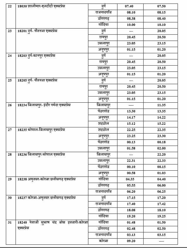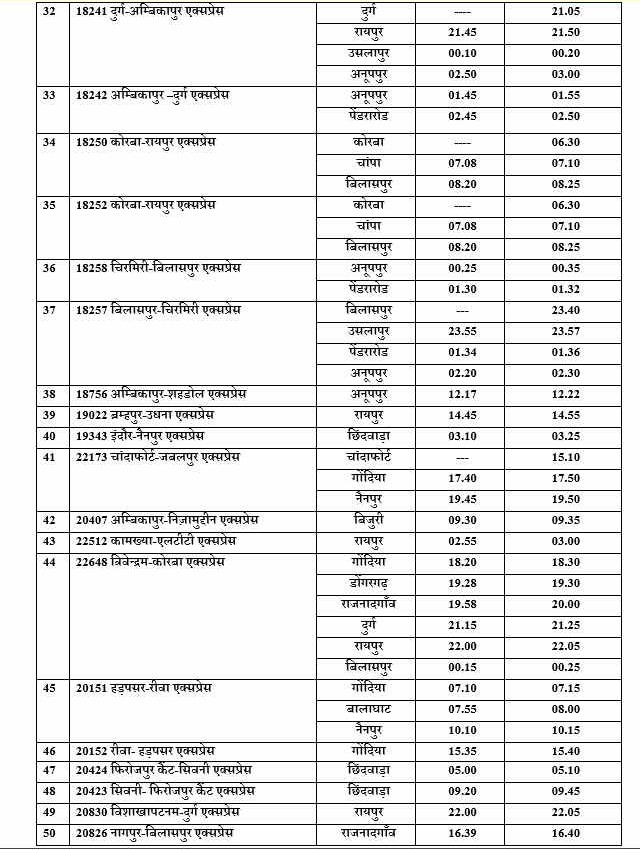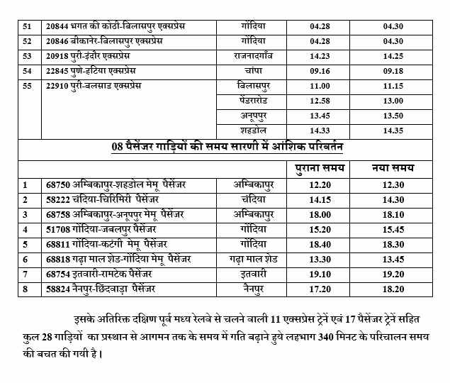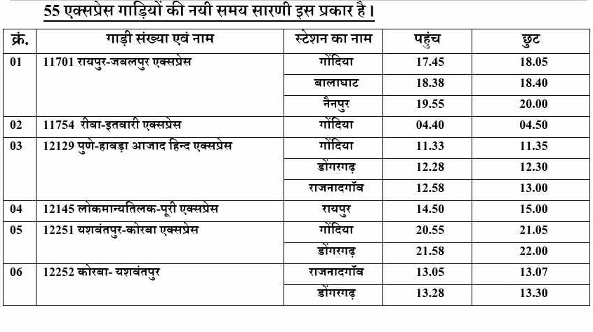 रायपुर : समय समय पर ट्रेनों का परिचालन समय बदला जाता है, जिसका कारण तकनीकी तौर पर ट्रेनों का संचालन करना होता है, वहीँ अब फिर से कुछ ट्रेनों का समय बदला जा रहा है, ऐसे में नये साल यानि एक जनवरी से ट्रेनों का टाइम बदल जायेगा। रेलवे ने हर साल की तरह विभिन्न सेक्शनों में आधारभूत संरचना को और अधिक विकसित करते हुए इस साल भी भारतीय रेलवे की समय सारणी में आंशिक परिवर्तन किया है। दक्षिण पूर्व मध्य रेलवे में 55 गाड़ियों के समय में बदलाव किया गया है। जिसकी जानकारी आपके सामने आई है।