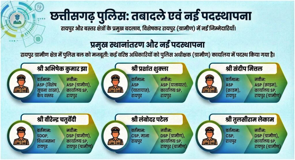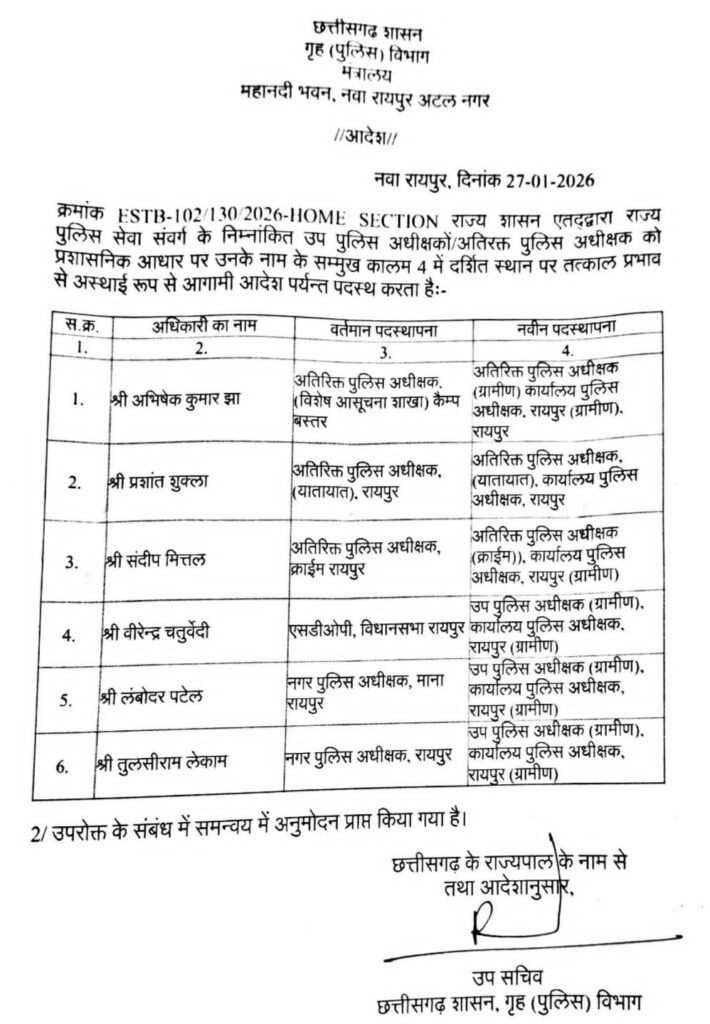रायपुर : समय – समय पर आवश्यकता के अनुरूप अधिकारियों का तबादला किया जाता है, ऐसे में छत्तीसगढ़ शासन के गृह (पुलिस) विभाग ने प्रशासनिक आधार पर राज्य पुलिस सेवा संवर्ग के अधिकारियों के स्थानांतरण और नवीन पदस्थापना का आदेश जारी किया है। महानदी भवन से जारी इस आधिकारिक आदेश के तहत अतिरिक्त पुलिस अधीक्षक (ASP) और उप पुलिस अधीक्षक (DSP) स्तर के अधिकारियों की जिम्मेदारियों में फेरबदल किया गया है। जिसकी जानकारी सामने आई है।