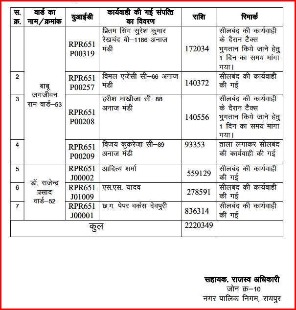 वहीँ नगर निगम ने पूर्व में संबंधित बकायादारों को डिमांड बिल, डिमांड नोटिस एवं अंतिम नोटिस जारी किया था। इसके बावजूद निर्धारित समय सीमा तक संपत्ति कर जोन कार्यालय में जमा नहीं किया गया है। इसके बाद निगम प्रशासन ने सख्ती दिखाते हुए बकायादारों के व्यावसायिक परिसरों को ताला लगाकर सीलबंद करने की कार्यवाही की है, बड़े रसूखदारों पर निगम ने अब तक कार्यवाही क्यूँ नही की थी, ये निगम की कार्यप्रणाली पर सवाल खड़े करता है, वहीँ छोटे बकायादारों पर निगम की कार्यवाही तुरंत होती है।