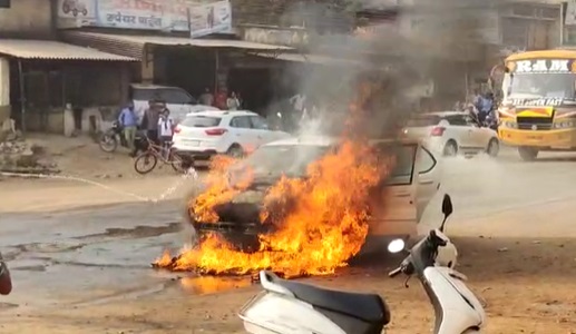 रायपुर। राजधानी रायपुर से लगे अभनपुर इलाके में चलती कार में अचानक आग लग गई। कार में पति-पत्नी और उनका लगभग दो साल का बच्चा सवार था। बताया जा रहा है कि अचानक कार के सामने तरफ से धुआं उठता देखने पर दंपति कार रोककर नीचे उतर गए और अपनी जान बचाई। देखते ही देखते कार में भीषण आग लग गई।