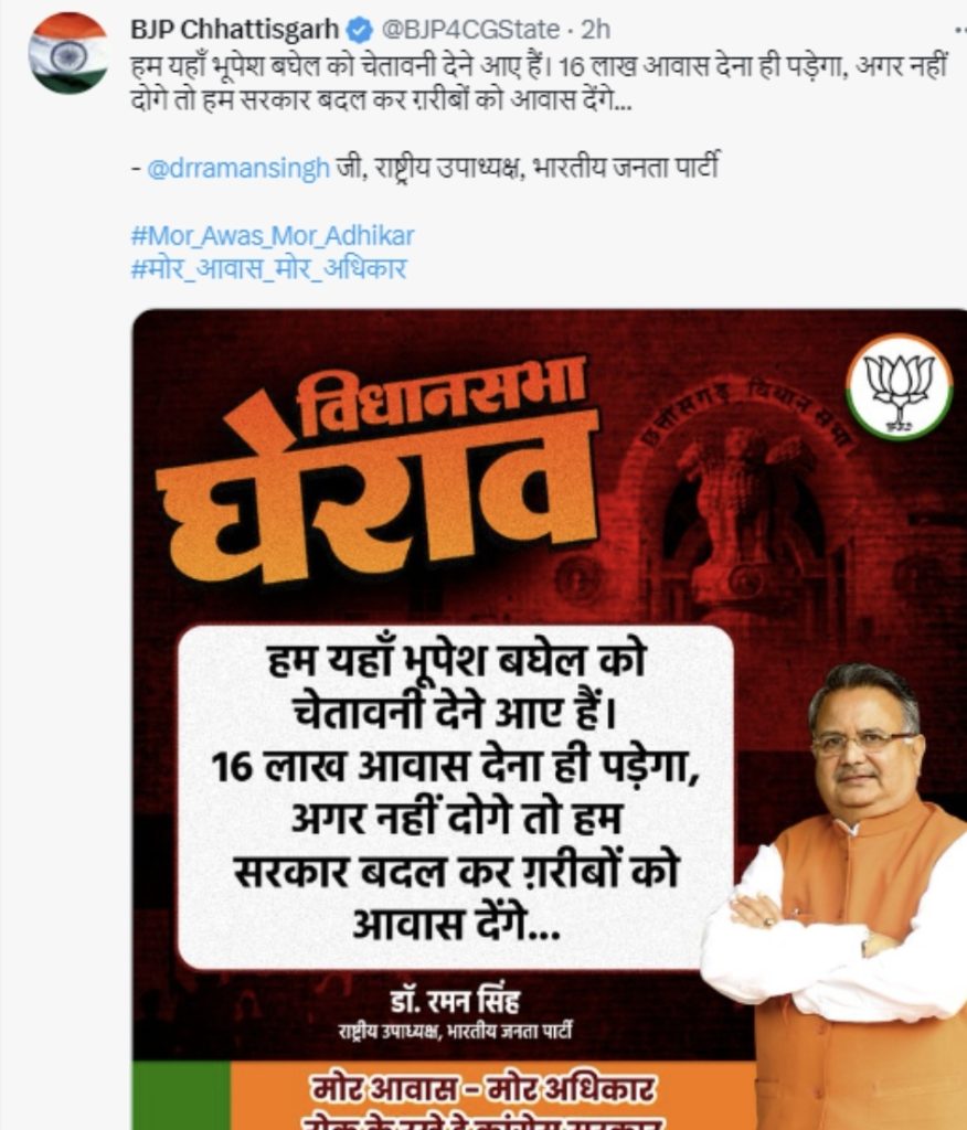 राहुल गांधी जी कहते है मेरे पास आवास नहीं है। अरे राहुल गांधी जी छत्तीसगढ़ में आकर देखो 16 लाख गरीबों का आवास छीनने वाला अकेला भूपेश सरकार है।