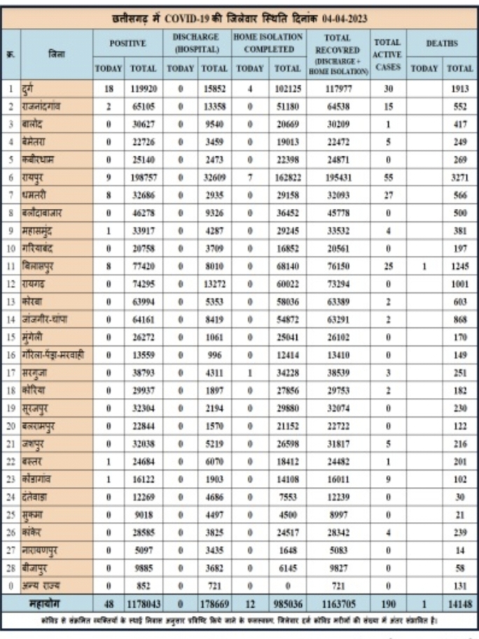 रायपुर। छत्तीसगढ़ में कोरोना के बढ़ते मामले ने चिंता बढ़ा दी है। वहीँ छत्तीसगढ़ में बीते 24 घंटों में 48 नए कोरोना मामले की पुष्टि हुई है, तो वहीं 12 लोग कोरोना से स्वस्थ हुए है।