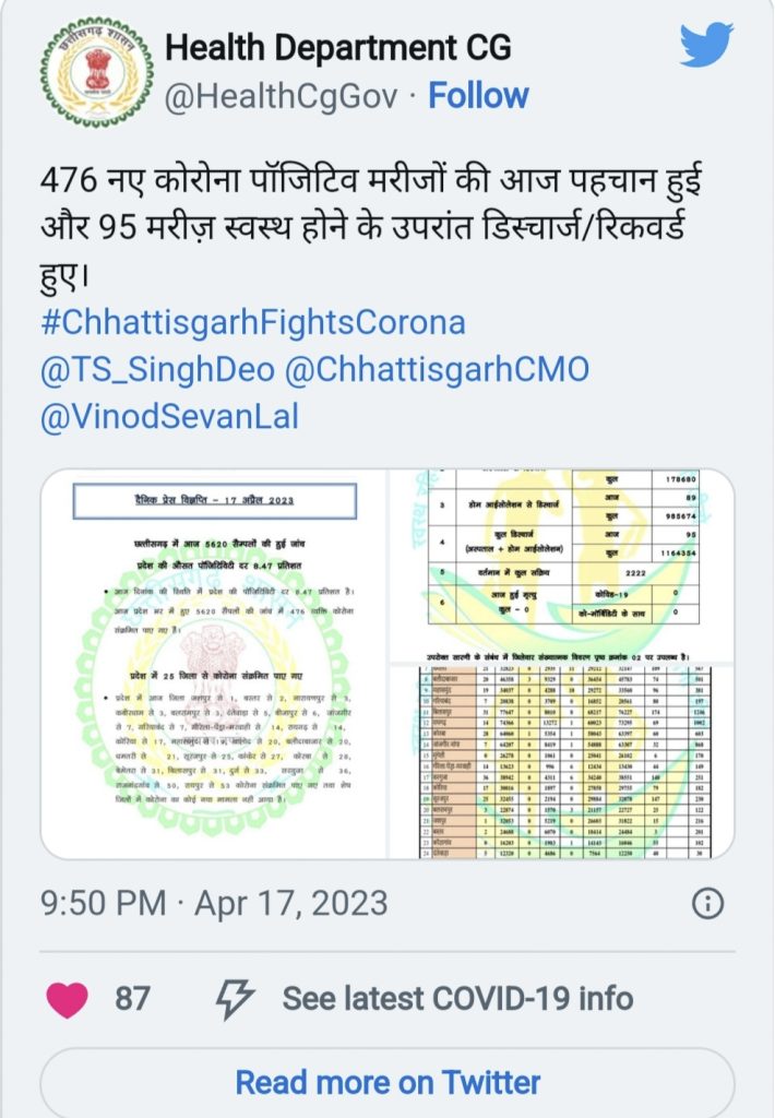रायपुर । छत्तीसगढ़ में आज कोरोना संक्रमण के कुल 476 नए मामलों की पुष्टि की गई है। राज्य में आज सर्वाधिक 53 केस रायपुर जिले से मिले है। वहीं राज्य में आज कुल 95 कोरोना मरीजों को डिस्चार्ज किया गया है।