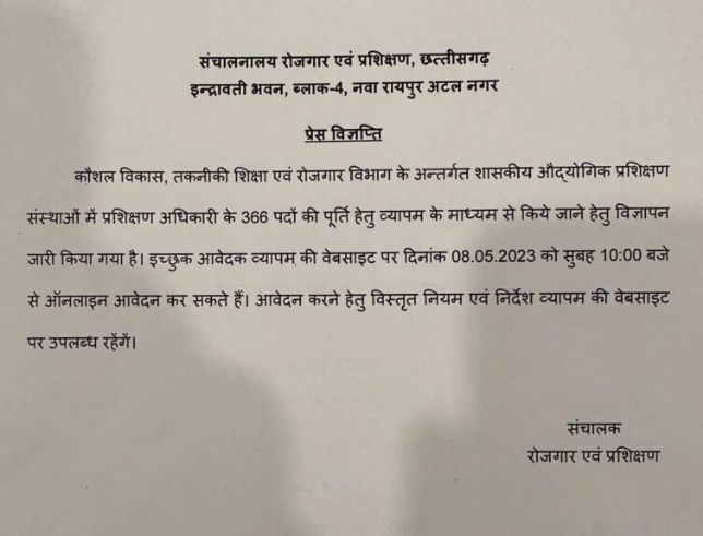 रायपुर । मुख्यमंत्री भूपेश बघेल ने प्रदेश के युवाओ को बड़ी सौगात दी है। छत्तीसगढ़ सरकार द्वारा सरकारी नौकरी में भर्ती का सिलसिला लगातार जारी है। शासकीय औद्योगिक प्रशिक्षण संस्थानों में प्रशिक्षण अधिकारी के 366 पदों के लिए विज्ञापन जारी किया है।