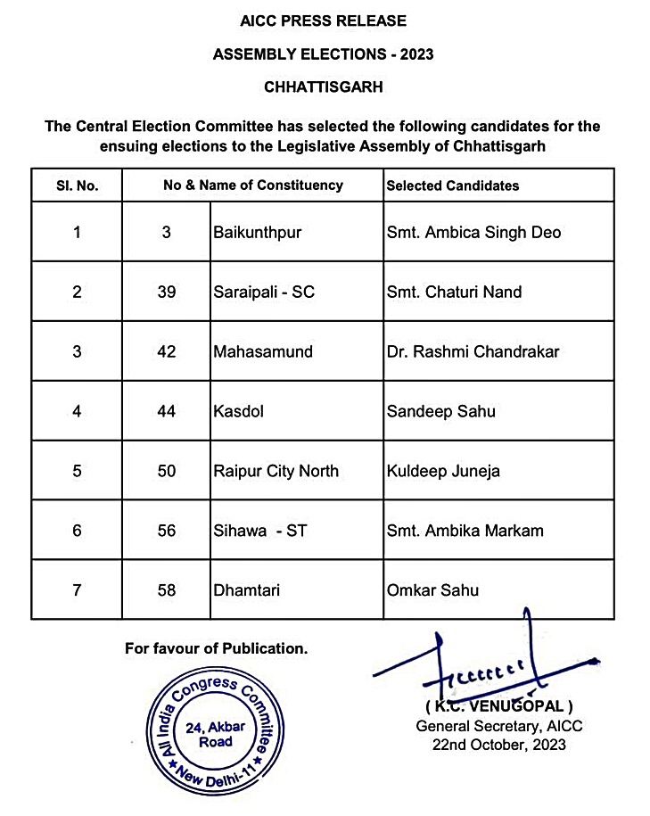 वहीं बैंकुठपुर में अंबिका सिंहदेव दोबारा चुनावी मैदान में उतारी गई हैं। धमतरी सीट पर 2018 में कांग्रेस से गुरुमुख सिंह होरा चुनाव लड़े थे जो हार गए थे। उनका भी टिकट काटकर ओमकार साहू को दिया गया है। कसडोल, सरायपाली, महासमुंद, सिहावा सीट पर कांग्रेस ने विधायकों का टिकट काटकर नए प्रत्याशी उतारे हैं। इस तरह प्रदेश क 90 सीटों में अब तक कुल 18 महिलाएं, अब तक कुल 29 ओबीसी वर्ग से प्रत्याशी उतारे गए हैं।