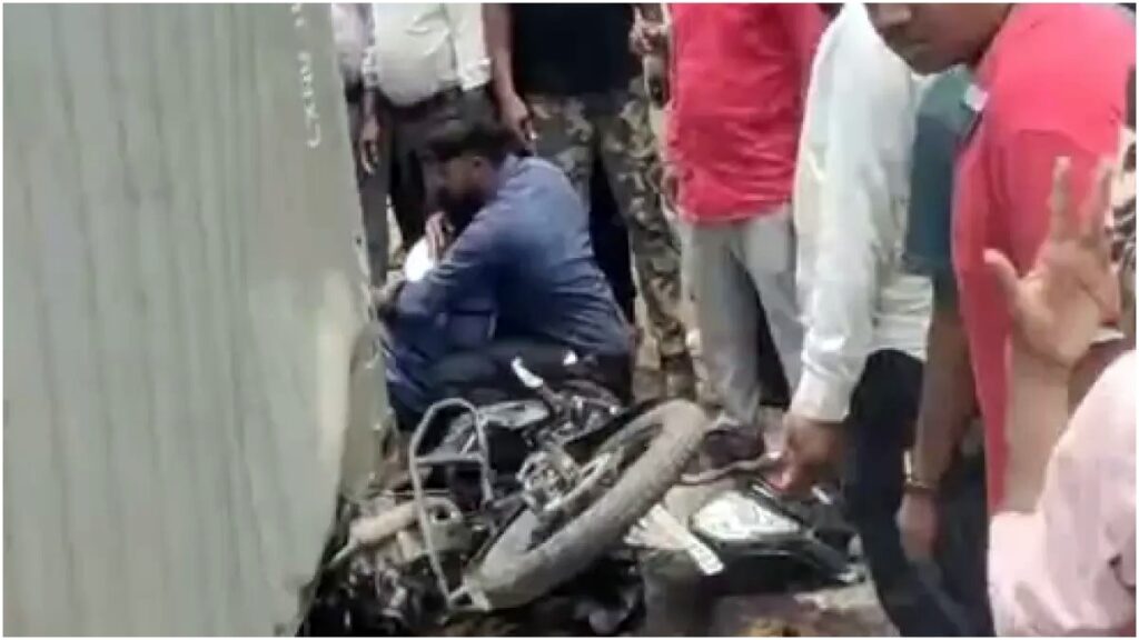 सवारी बस ने मारा ब्रेक तो पीछे आ रहे ट्रेलर का कंटेनर पलटा बाईक सवार पर, सामने आई ये दहलाने वाली खबर….।