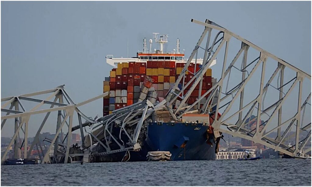 अमेरिका में मालवाहक जहाज पुल से टकराया, पुल ढहने से नदी में गिरे कई वाहन, कई मौतों की आशंका।