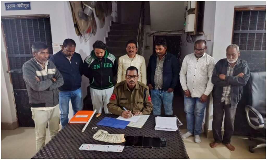 जुआ खेलते पकड़े गये जुआरी, दस हजार की रकम जब्त, लखेश्वर साहू, देवेन्द्र सोनी सहित 7 आरोपी गिरफ्त में।