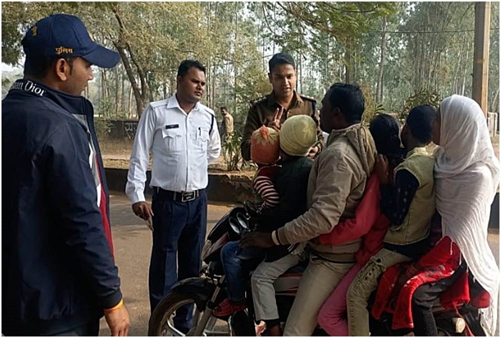 पुलिस जाँच के दौरान एक बाईक पर छै सवार, पकड़ में आने पर बताया ये कारण….। पुलिस ने भेजा ई-रिक्शा से।