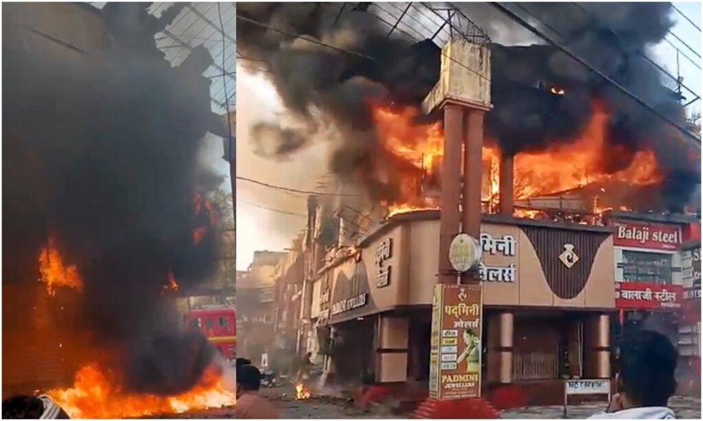 कोरबा के एसएस प्लाजा में लगी भयानक आग, कई दुकानें आई चपेट में, बड़े नुकसान की आशंका।