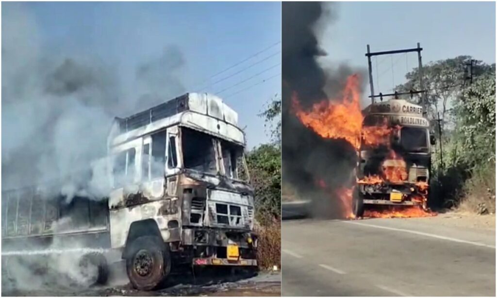 टायर में फटने के बाद ट्रक में लगी भयानक आग, नेशनल हाईवे पर हुआ बड़ा हादसा।